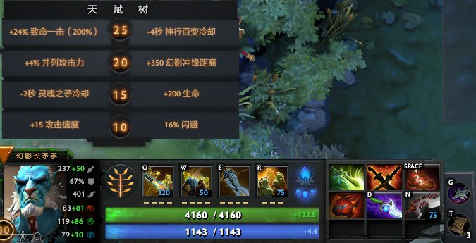 以灵魂之矛为主,使得幻影长矛手拥有不错的输出,四级的时候可以考虑升一级并列,偶尔出现的幻象可以被调用去周边如树林、河道作为移动眼位使用。能够防止幻影长矛手被GANK。