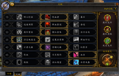 5、第一是坦克天赋,献血专精;第二是输出天赋,冰霜专精和邪恶专精,其中冰霜专精由于有萨萨里安的威胁天赋影响,可以让冰霜DK装备两把单手剑进行双持输出,其属性选择有别于双手冰DK。