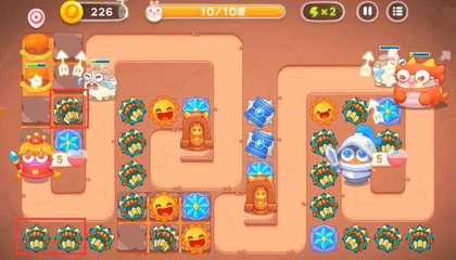 2、开局先在两个滑道右侧各自放上一个拳头,拖到最右边,先把右侧的道具清掉。先在滑道中间位置放上2个月亮提供减速,之后在滑道左侧继续补充2个拳头增强火力,此时要注意控制滑道上的炮塔跟着怪群走。