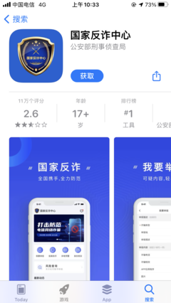 2、打开App Store。点击右下角的搜索。在上方搜索框中输入国家反诈中心。点击应用右边的获取即可下载安装。下载完成后进入app,输入个人信息即可完成注册。