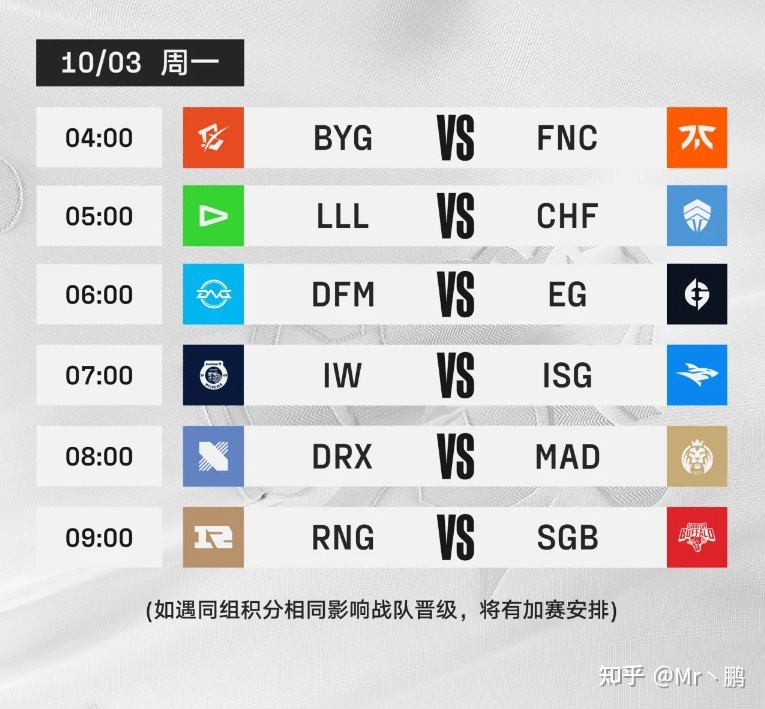 2、月21日5点,JDG vs RGE,10月22日5点,T1 vs RNG,10月23日5点,GEN vs DK,10月24日5点,DRX vs EDG。