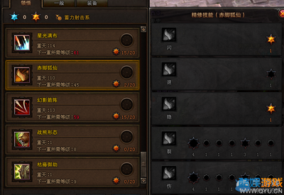 5、其他精修技能无大用处。第六层,箭星破。它的精修技能点上“闪”(用于闪躲,移动射击系必备),“晕”(晕3秒,多个目标,必点),“速”(提高攻速,必点)。第七层,星光满布。