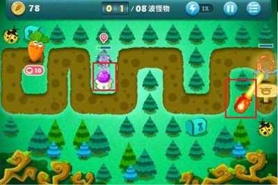 4、保卫萝卜4阿波尼克号第32关攻略玩家进入游戏可以发现这一关卡安放的防御塔很少。玩家开局可以在下图框框地方安放一个风扇,左边安放一个鱼雷塔,可以边刷怪边开图。
