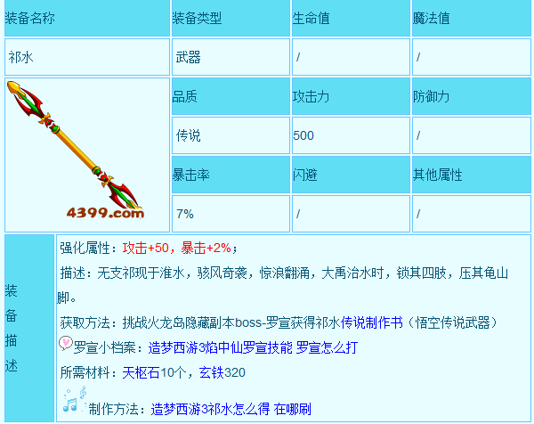 5、祁水 祁水是悟空目前最好的武器了,攻击,暴击都是最高的。初始属性:攻击500 暴击7% 强化属性 攻击+50 暴击+2% 总体来说祁水还是不错的 祁水是由祁水制作书打造的,祁水制作书由火龙岛隐藏副本——传说罗宣掉落。