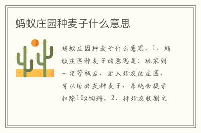 在蚂蚁庄园中,种麦子是一种互动玩法,它允许玩家在达到一定等级后,前往好友的庄园进行种植。每次种植,系统会自动扣除10克饲料。当好友完成收割时,他们将获得10克饲料作为收成。这种机制实际上是一种饲料赠送方式,只不过它通过种植麦子的趣味性互动来表现。