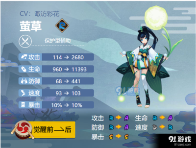 御魂位置:2号位:攻击 4号位:攻击 6号位:暴击/攻击 点评:萤草是战斗护士和吸血鬼护士。当团队中的角色(包括阴阳师)不濒危(血线低)时,AI自动操作会优先发动普攻,而不是补血技能。